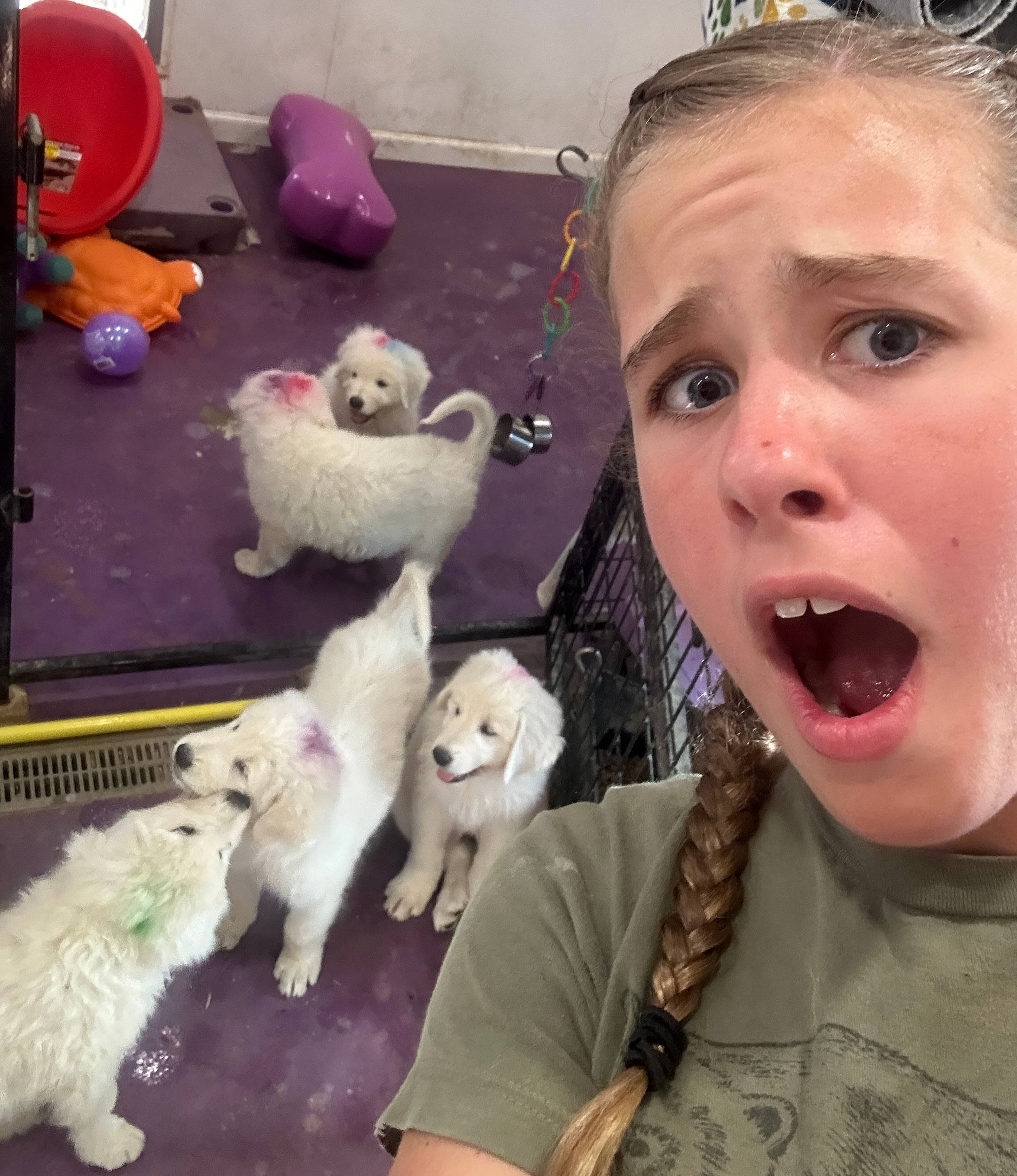 But I had a surprise visit from my oldest daughter, Ashley, and her youngest child, Audrey. Whenever my grandkids visit, I take the opportunity to have some puppy socialization time. So Audrey and I went to the air-conditioned Puppy Parlor to play with Marcella’s 6-week-old pups. (Which is a great place to be when it’s 110 degrees outside! I am so thankful my puppies don’t have to be out in this heat. Nor do I!)
