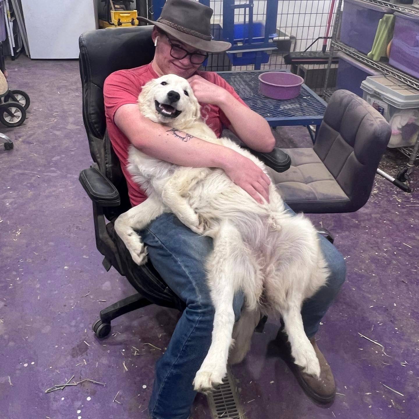 While I was sitting around whiling away the hours in the airport I was chatting with my client, Dave, who lives in Texas. Dave has Bear and Chief, two of my pups from my Jan 2022 litter. The boys guard a huge flock of free range chickens and a small herd of cattle on Dave’s 55 acre ranch. And they are spoiled rotten by Dave and his wife, Susan. I get frequent updates from Dave on the adventures of Bear and Chief and